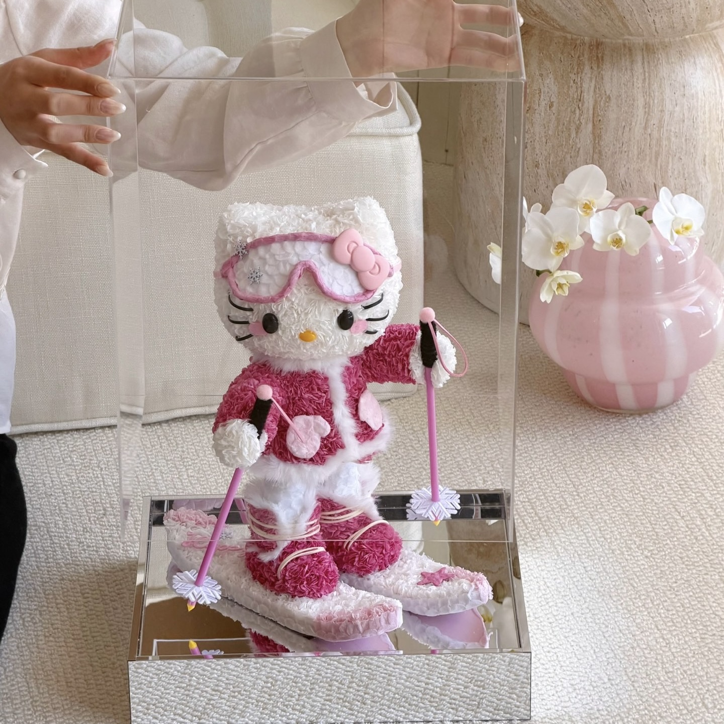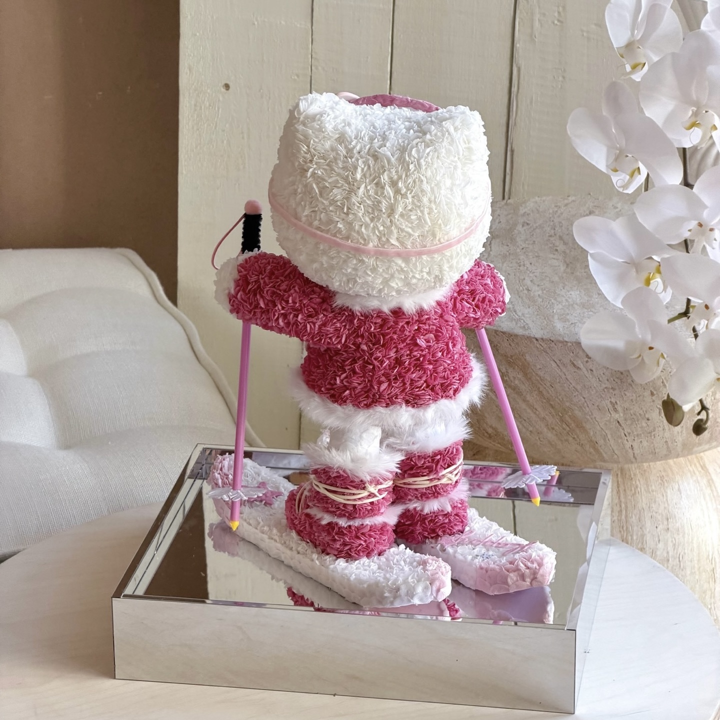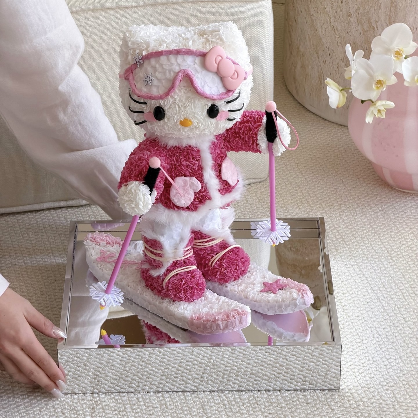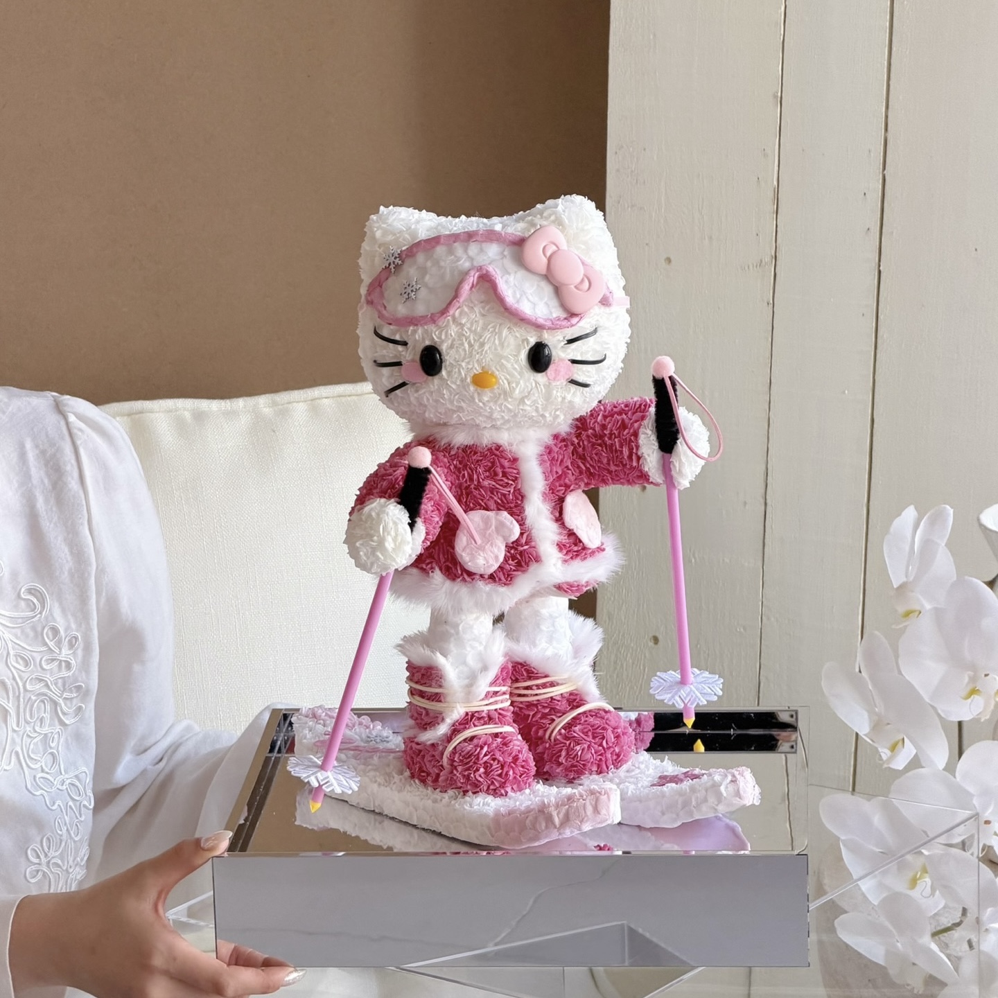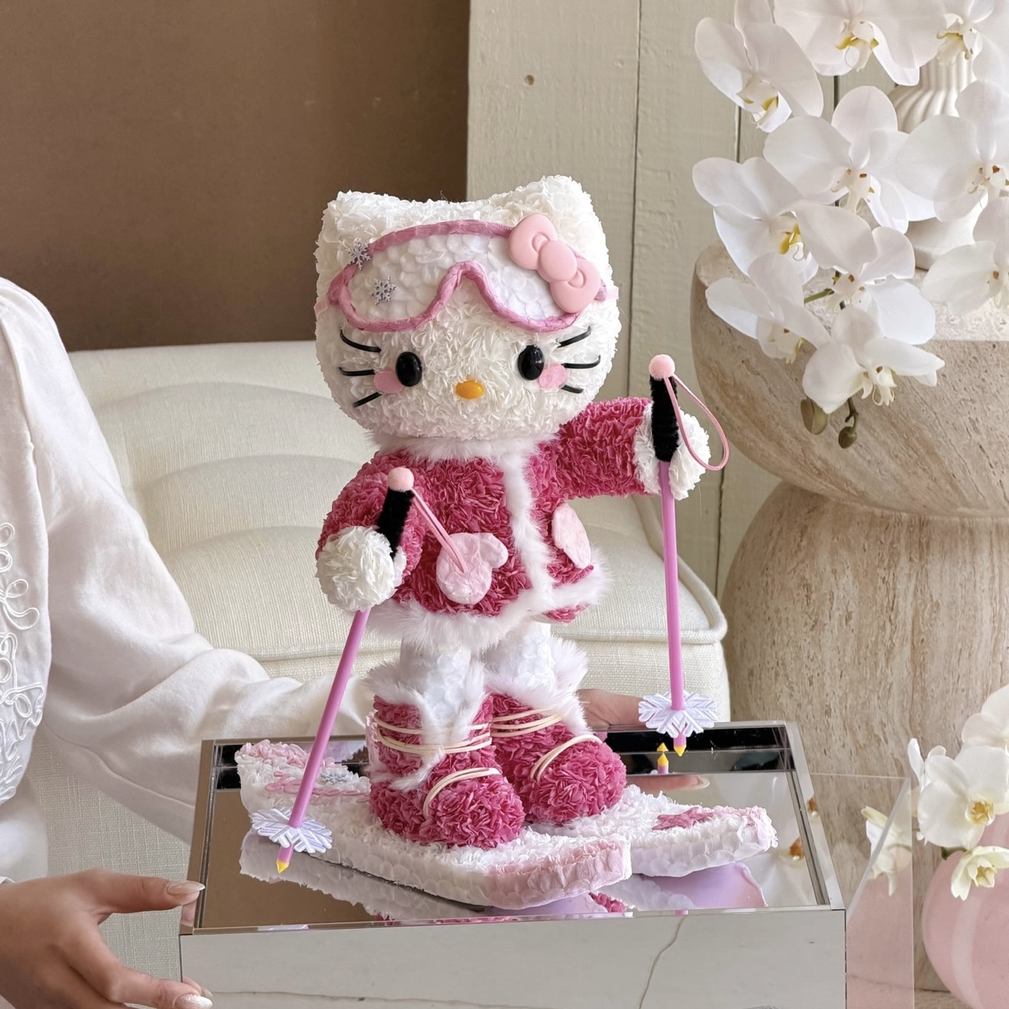 白銀のゲレンデを颯爽と滑り降りるキティを、数千輪の厳選された花々で表現しました。